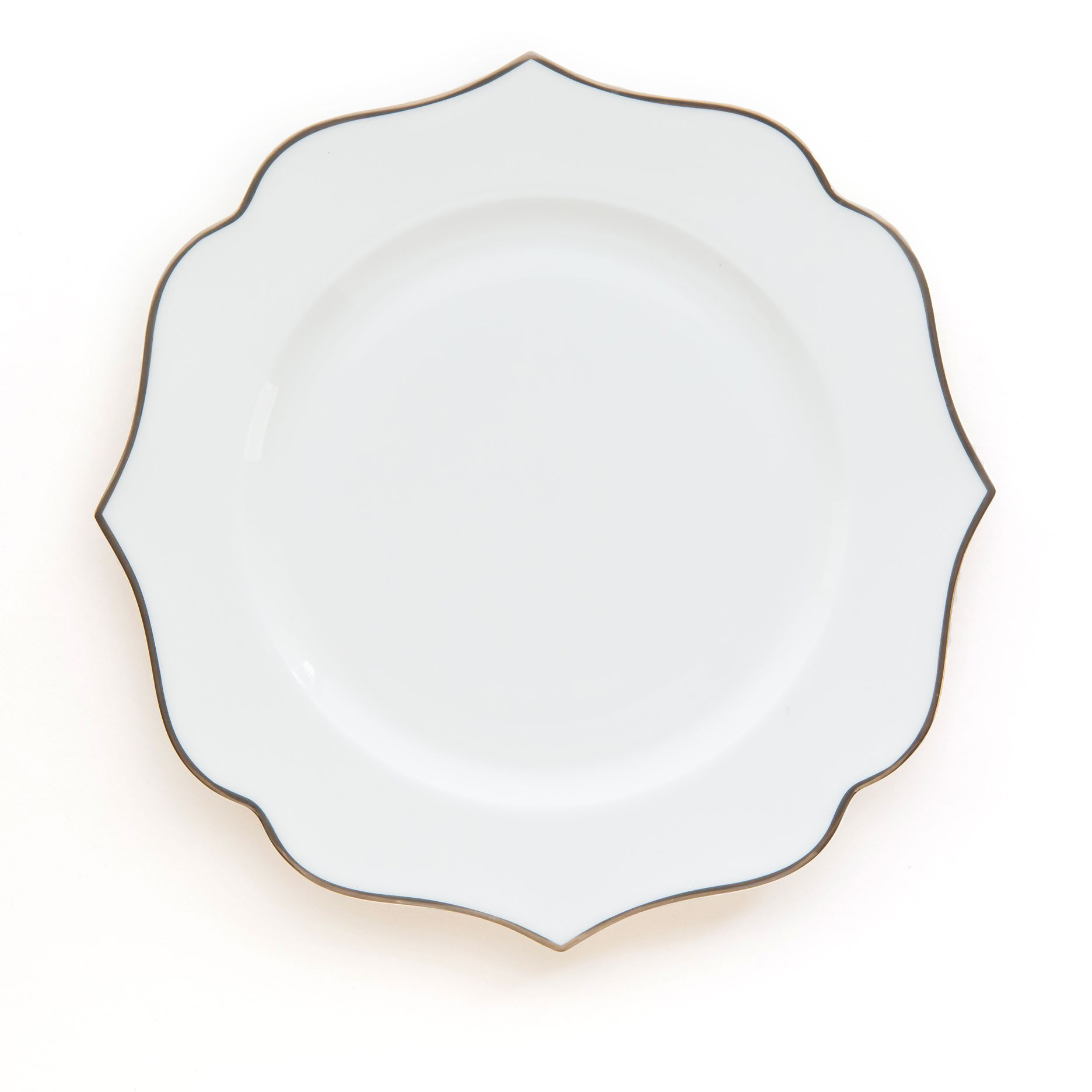 The Incanto Silver Rim Collection features refined white dinnerware with elegant scalloped edges and silver trim. Ideal for weddings, upscale events, and formal dinners. Available for rent to add sophistication to your table design.